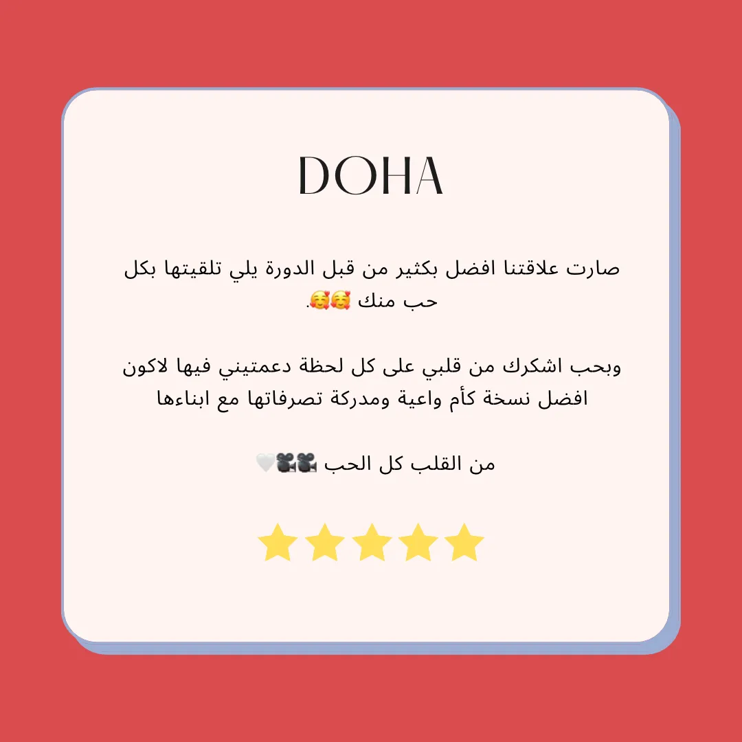 ورسالتي هي أن أجعل التربية تجربة إيجابية لك ولعائلتك، بعيدًا عن الضغط النفسي والتوتر، وقريبة من السعادة والأسترخاء والاستمتاع بالأمومة